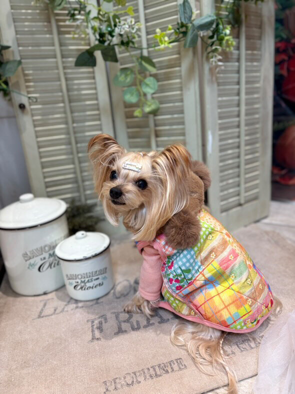 柔らかなファーとコットンプリントを組み合わせたキルティングベスト⭐︎